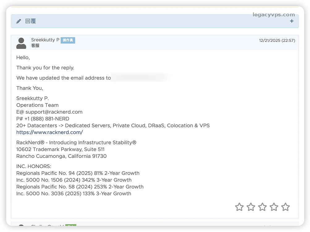 RackNerd 除了部分特定的闪购套餐(Flash Sale)会限制修改邮箱,大多数套餐的账户都可以通过发工单的方式申请修改绑定的邮箱,但是一般只能修改一次,如果次数过多可能要求,使用官方的PUSH(需要收费,一次8美元)。
